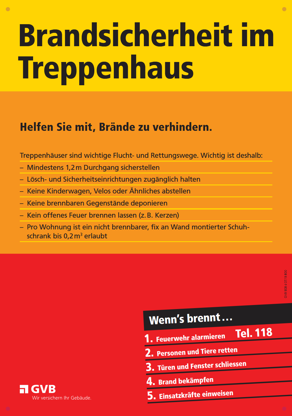 • Bei verrauchten Treppenhäusern und Korridoren im Zimmer bleiben, Türen abdichten und auf die Feuerwehr warten (sich am geschlossenen Fenster bemerkbar machen)